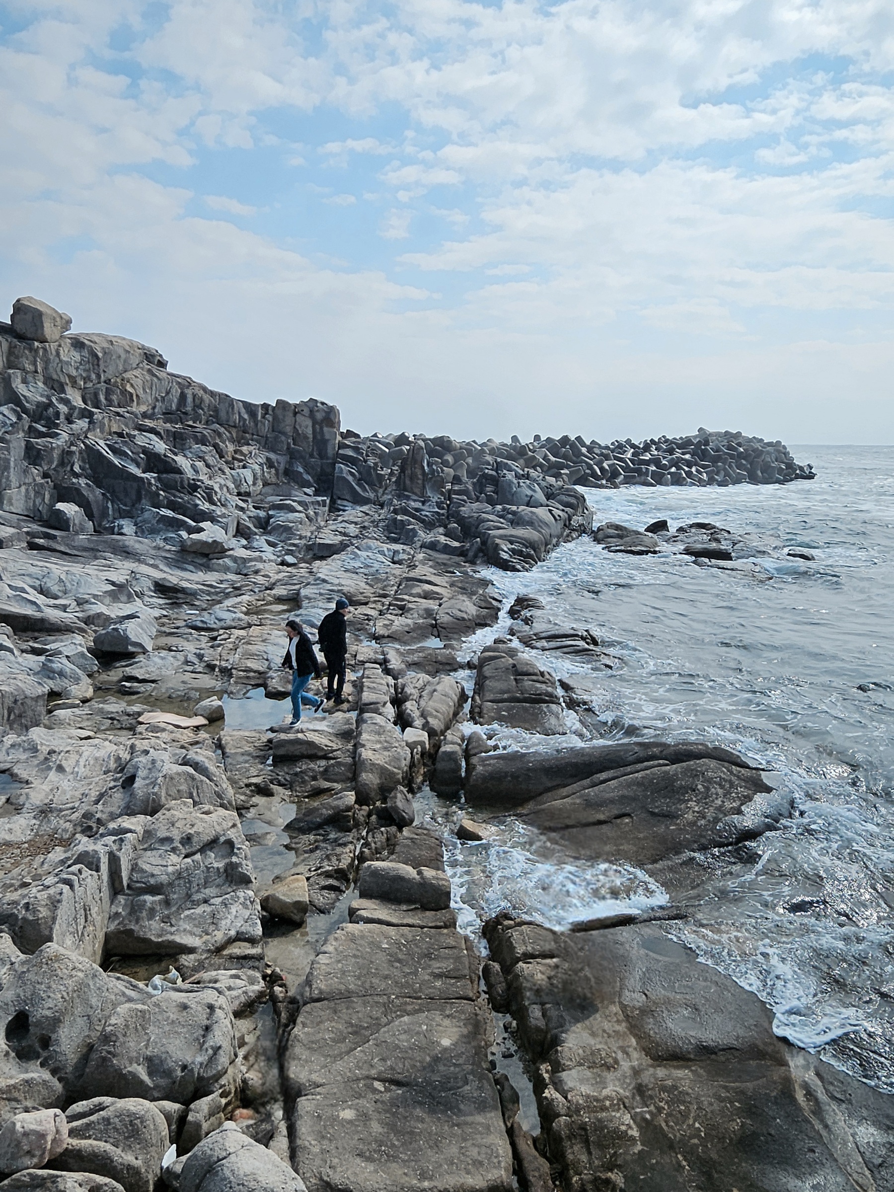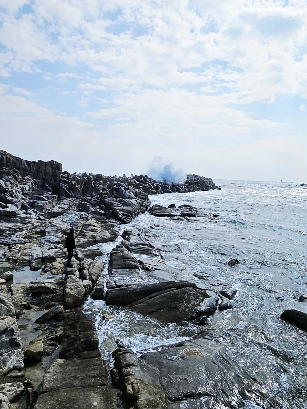 일행들이 이곳을 지나치지 않고 들어갑니다. 방파제로 담을 만들어놓은 곳에 압도적인 파도가 방파제를 넘습니다. 파도가 이렇게 거센지 몰랐다면 위험했겠죠? 방파제를 넘는 거센 파도가 만들어질 때마다 풍경이 장관이었습니다. 파도의 역동적인 모습 오랜만이네요. 파도소리도 엄청 크게 들림.
