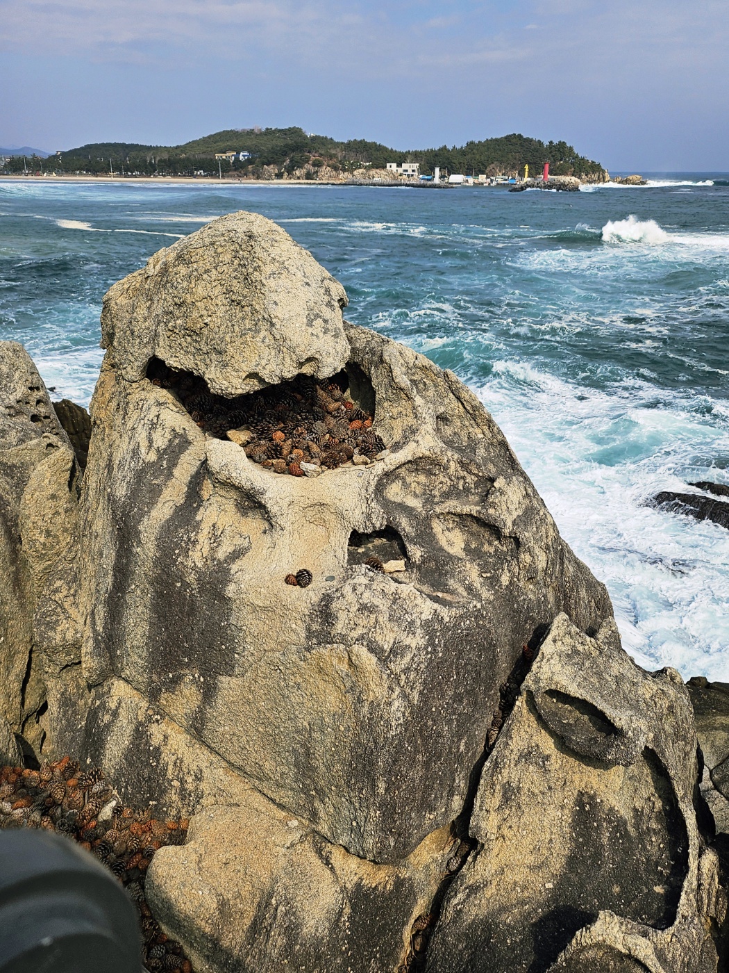 3월에 보는 능파대 주변 바다는 파도가 매우 거세게 몰아쳤습니다. 여기에서 보는 돌들이 참 특별하죠? 구멍 한 바위구멍에 누군가 바위 안에 솔방울들을 가득 채워둔 모습이 귀엽네요.