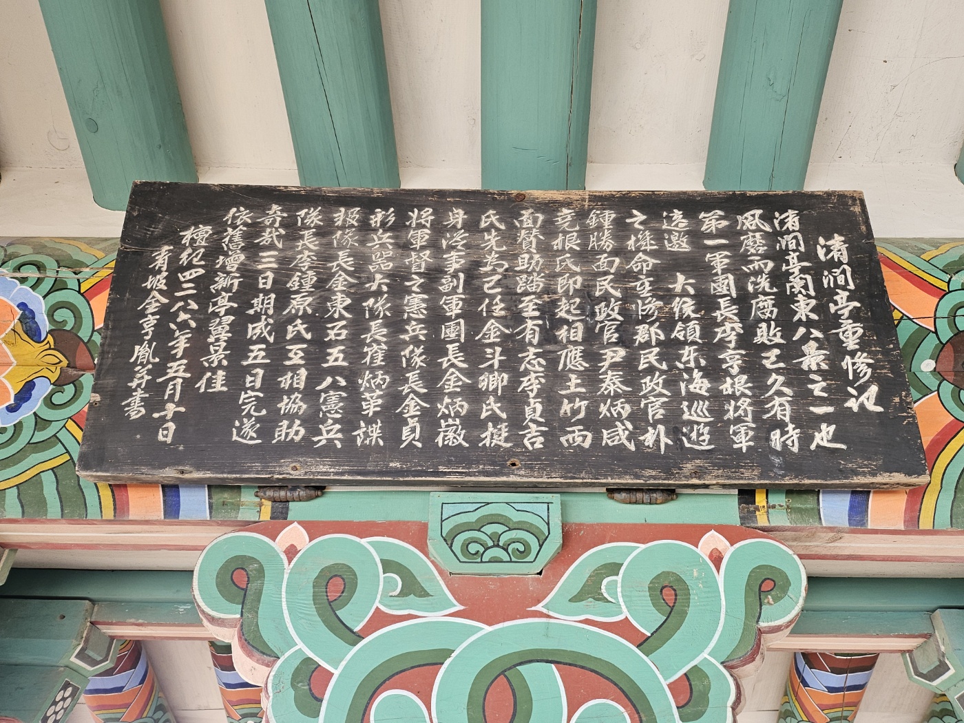 1953년 전쟁 직후 청간정 5월 10일에 완공되었다. 제1군단장 이형근 장군과 민정관 윤태병 등의 주도로 청간정의 보수를 단행. 전쟁 등으로 인해 낡고 허물어졌던 청간정을 다시 고쳐 지은(중수) 과정을 기록한 글.